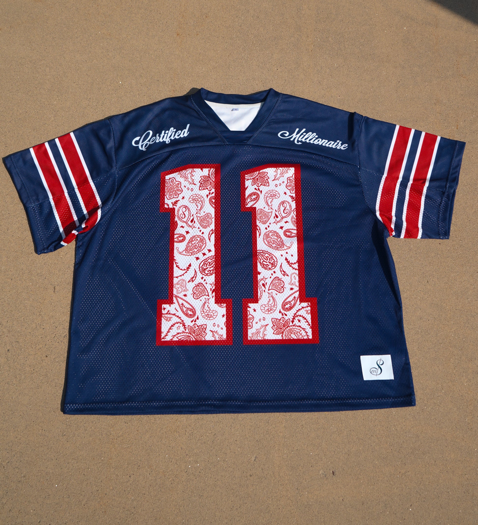 Engineered for those who never fold. This breathable mesh jersey features bold red paisley “11” detailing and varsity-inspired sleeve stripes. Finished with “Certified” and “Millionaire” across the chest—because winning is in your DNA.